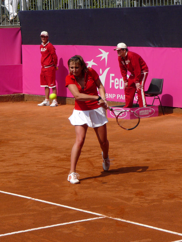 Doch beim ersten Aufschlagspiel von Stefi kam Unsicherheit in das Heimteam. Sie hatte im Jahr 2009 den Durchbruch in die Top 100 geschafft und stand 2010 vor der schweren Aufgabe der Bestätigung, vor der nun zum Beispiel in 2011 auch Johanna Larsson steht. Da spielt man dann an höher dotierten und stärker besetzten Turnieren, was automatisch zu mehr Niederlagen führt. Da kassiert man die eine oder andere Niederlage zu viel und dann kommen noch kleine Verletzungen hinzu und schon hat man sich nach einem Jahr aus den Plätzen verabschiedet, die eine direkte Aufnahme in Grand Slam-Felder garantieren. Etwa so sieht es momentan bei Stefi aus. Ihre Leistung in diesem Doppel hat mich leider negativ überrascht und ich hatte mich für dieses Fed Cup-Wochenende auch noch auf die "falsche" Seite geschlagen. Alles in allem also etwas unglücklich. Gerade beim Aufschlag bemerkte man das auf und ab. Der Aufschlag ist ein Schlag, den man mit Trainingsfleiss stark verbessern kann. Diesen Fleiss hat sie und teilweise kamen die Aufschläge wirklich stark. Andererseits ist eine gewisse Unsicherheit vorhanden und das sieht man in anderen Momenten den Aufschlägen dann auch sofort wieder an.