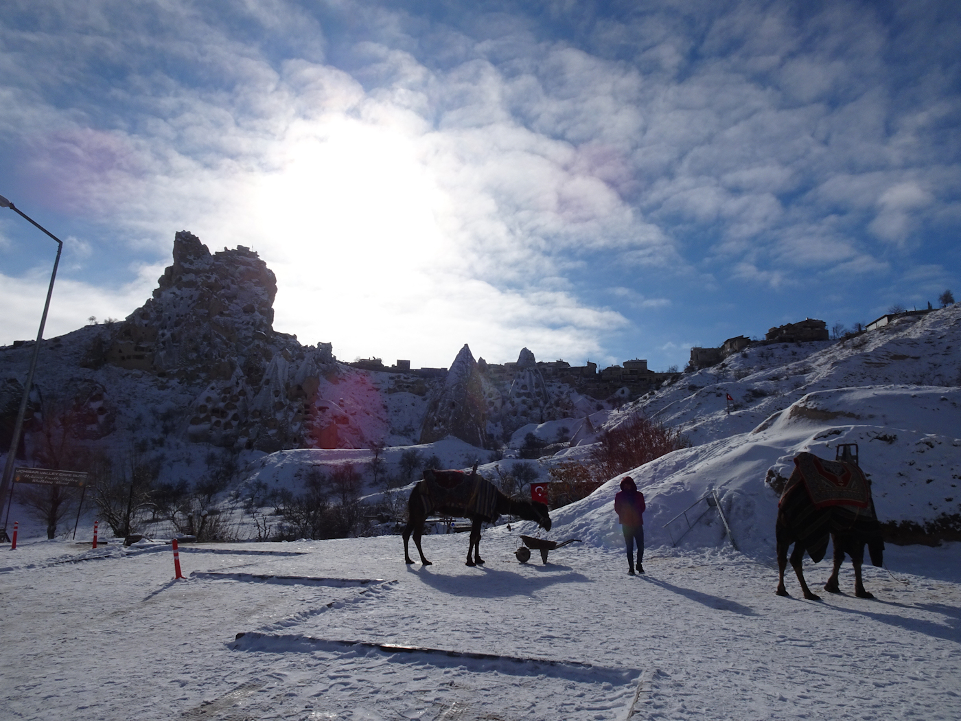 Das Uchisar Castle im Schnee und Sonnenschein am Freitagmorgen war eine
