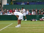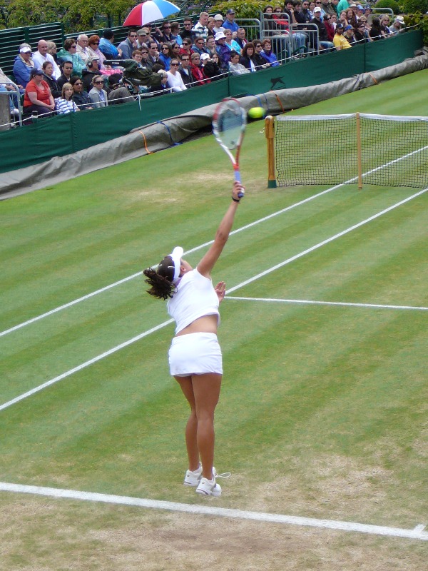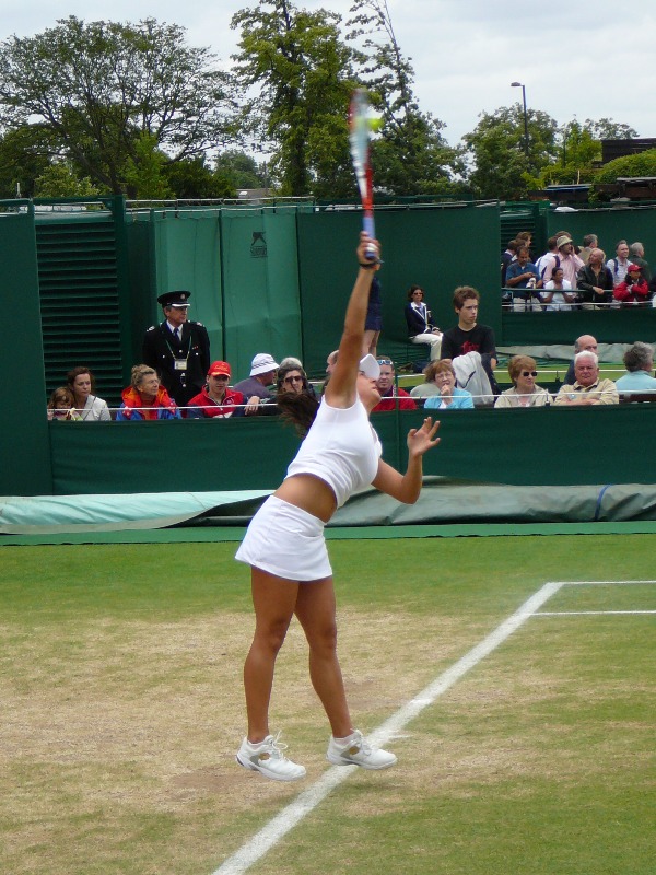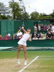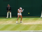 Eigentlich hätte ich diese Partie nie gesehen. Sie war auf 11 Uhr Samstag angesetzt. Mein Flugzeug kam erst am Mittag an und hatte erst noch massive Verspätung. Der Regen in London "half" mir also etwas. So schnell wie möglich zur Anlage sah ich beim Anstehen an Court 3 gerade das Ende des ersten Satzes von 3:4 zum 3:6. Diese zwei Games gingen aus Sicht von Paszek sehr unglücklich verloren. Es lief einfach nicht ganz wie gewünscht mit den Schlägen. Bild 1 war das Einzige, welches ich am Samstag schoss. Danach begann es gleich wieder zu regnen und der ganze Tag viel ins Wasser. Am Montag ging die Partie beim Stand von 3:6 1:0 und 0:30 bei Aufschlag Dementieva weiter. Und was sehe ich da? Elena Dementieva spielte Tamira Paszek jeden Ball auf die Rückhand. Hat die 25-jährige Russin denn nicht gemerkt, dass dies die starke Seite der Österreicherin ist? Die Partie erinnerte mich an Dementieva-Peer in Paris 2006. Auch dort wurden unzählige Rückhandduelle gespielt, aus welchen jeweils die Newcomerin Peer als Siegerin hervorging. Ab Mitte des zweiten Satzes versuchte Dementieva dann wenigstens, die Vorhand Paszeks anzuvisieren. Aber der zweite Satz ging klar an die angestachelte Aussenseiterin (Bild 14). Ein Schlüssel zum Erfolg für Tamira Paszek waren die tiefen Bälle, vornehmlich auf Dementievas Rückhand. Kann die zweifache Grand Slam-Finalistin die Bälle von einer angenehmen Höhe schlagen (Bilder 9-10), wird es extrem gefährlich. Muss die 180cm grosse Russin allerdings tief hinunter (Bilder 11-13), kann sie nicht mehr den gleichen Druck ausüben. Sie bewegt sich zwar sehr gut und geht schön in die Knie, wird aber bei Schlaghärte und Winkel rein durch die Netzhöhe eingeschränkt. Das flache Spiel von Tamira wird diesbezüglich durch den Rasenbelag zusätzlich unterstützt. Es kommt nicht von ungefähr, dass sie bereits mit 14 Jahren im Juniorinnen-Finale von Wimbledon gestanden war. Ein weiterer Erfolgsgarant war Tamiras Defensivleistung. Dies ist aber auch eine der Stärken Dementievas. An den US Open 2005 zum Beispiel rang sie so Chakvetadze nieder. Hier in Wimbledon war es jedoch die 16-jährige Österreicherin, die sich dank exzellenter Verteidigung einen Vorteil verschaffen konnte. Verteidigung heisst Beinarbeit, das Spiel gut lesen zu können sowie in schwierigen Situationen die Technik zu haben, um den Ball sinnvoll zurückzubringen. Erfolgsfaktor Nummer 3 war die mentale Stärke. Dies ist wohl neben allem Talent und Technik der wichtigste Faktor von allen. Nach fünf respektive sechs Aufschlagdurchbrüchen in den ersten beiden Sätzen gab es im dritten Satz nur ein einziges Break. Dies hatte sich Paszek zum 2:0 geholt. Danach musste sie diesen Vorsprung gegen eine stärker werdende Gegnerin verteidigen. Denn Elena Dementieva gelang es gegen Ende der Partie immer öfter, Gewinnschläge anzusetzen und Paszek wegzuschiessen. Tamira blieb bei ihrem Aufschlag standhaft und liess keinen einzigen Breakball zu. Bei 4:2 und 30:15 spielte sie einen sensationellen Stoppball: Aus der Vorhandecke auf Höhe der Grundlinie stehend legte sie mit viel Tempo einen wundervollen Stoppball cross hinein. Da wurden irgendwie die physikalischen Gesetze ausgehebelt. So einen Schlag gibt es gar nicht! Es war schon der zweite erfolgreiche Stoppball im selben wichtigen Game gewesen, was die Entschlossenheit und das Selbstvertrauen der 16-jährigen untermauert. Auch vom aufkommenden Regen liess sich Tamira nicht mehr aufhalten. Kommen wir zu den Schwächen in Tamiras