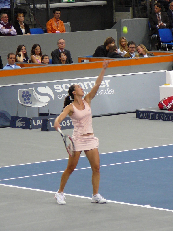 Tatiana Golovin, die einzige nicht gesetzte Spielerin neben den Top 3 im Halbfinale, zeigte gegen Svetlana Kuznetsova eine starke Leistung. Sie baute ihr druckvolles Spiel über einen starken Aufschlag auf. Wie im ersten Halbfinale servierten auch in dieser Partie beide Spielerinnen stark. Der Französin gelangen acht Asse, der Russin deren sechs. US Open-Finalistin Kuznetsova war durch eine Fussverletzung handicapiert. Nach dem ersten Seitenwechsel humpelte sie plötzlich stark, als sie wieder los lief. Vermutlich hatte sie beim Aufstehen von der Bank ganz einfach nicht daran gedacht, dass sie Schmerzen hat. Denn die Verletzung schien mir nicht neu zu sein. Die 22-jährige St. Petersburger bewegte sich schlecht und ging viel zu schnell auf den Winner. Dadurch lag ihre Fehlerquote viel zu hoch und sie verlor nach dem gewonnen Aufschlagspiel zum Auftakt der Partie gleich fünf Games in Folge. Der zweite Satz war umkämpfter. Kuznetsova ging nun längere Ballwechsel ein und spielte sicherer und geduldiger. Das frühe Break Golovins zum 2:1 und die anschliessende hartumkämpfte Bestätigung bei eigenem Aufschlag brachten aber die Vorentscheidung zu Gunsten der Vorjahresfinalistin. Die in Russland geborene Französin, die mittlerweile in Miami lebt, baute ihre Führung im direkten Duell mit Kuznetsova damit auf 3:1 aus. Gegen Jahresende macht sich die lange Saison bemerkbar. Mir kam die vergleichbare Situation vom letzten Jahr in den Sinn, als Kuznetsova in Zürich ebenfalls im Halbfinale aufgrund einer Fussverletzung unterlag. Balljungs gab es in Stuttgart übrigens keine. Die hätten ja auch nicht in das Röckchen gepasst (Bild 3). ;-)